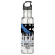 Este design apresenta uma bandeira da polícia com listras pretas e brancas, e uma fina faixa azul de linha também. Esta garrafa de água é excelente por mostrar apreço a um xerife oficial, capitão, ou chefe pelo seu serviço e reconhecê-los como oficial do ano.