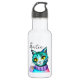 Adicione um nome a este gatinho teal, roxo, rosa e azul com garrafa de água de olhos amarelos.