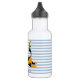 NewParkLane - Aí vem o problema! Garrafa de água das crianças bonitas, com um doce desenho de gato-cama em laranja e azul e um pequeno pássaro na cauda, contra um fundo listrado e azul macio, e um modelo de texto para seu nome ou outra mensagem pessoal.