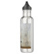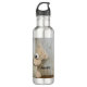 Garrafa de água com uma fotografia de querido de um urso de pelúcia fofo, em pé por uma parede russa de madeira / pano de fundo.