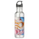 Um fecho de um líquido colorido, espumoso, com pequenas bolhas redondas a flutuar na superfície. O líquido é um azul vibrante com pistas de rosa e roxo.