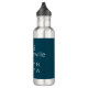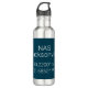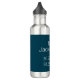 Frasco de água de aço inoxidável com coordenadas de latitude e longitude para a estação aérea naval dos EUA, NAS Jacksonville, no estilo de Flórida Roboto, com letra branca em fundo azul Marinho.