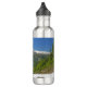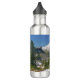 Aproveite uma paisagem magnífica das Montanhas Cascata com esta garrafa de água. Nesta foto cênica, o pico coberto de neve do Monte Baker sobe acima de uma paisagem alpina que inclui um lago pequeno e árvores verdes. As palavras "Monte Baker Washington" aparecem no céu azul acima do cume.