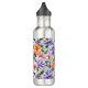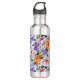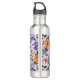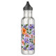 Muted watercolor style flower pattern of pink, orange, lavender flowers with green leaves on a mint background.