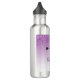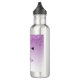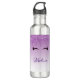 Uma garrafa de água com um design de na moda. O fundo é uma cor de gradiente roxo com brilho cintilante falso que desce do topo. Um par de pestanas giras e bonitas debaixo da lente.