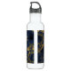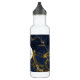 Uma garrafa de água personalizada com um na moda e fundo elegante de marinho azul e mármore dourado. Camadas sobre o topo é um círculo com uma borda falsa de folha de papel dourada com o seu dentro de texto personalizado.
