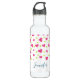 Garrafa de água personalizada com um padrão fofo composto de corações cor-de-rosa e verdes que tropeçam em fundo branco.