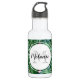 Uma garrafa d'água personalizada com um nome e um monograma de dentro inicial com um círculo branco. O fundo é um padrão de folhas exóticas de filosofia tropical em verde. Imagem digital pintada à mão. Uma dica de cor-de-rosa no fundo.
