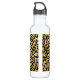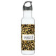 Garrafa de água com um padrão de na moda. Manchas negras negras exóticas num fundo de ouro. Um estilo selvagem mas elegante. Um quadro retangular branco com uma borda falsa de folha de alumínio dourada colocada sobre cima com seu dentro de texto personalizado.