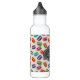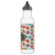 Garrafa de água personalizada com um padrão fofo de macarões em muitas cores diferentes com um padrão de bolinhas fraco atrás. Uma cinza com aspecto de vintage rico e uma moldura decorativa branca com o seu nome dentro.