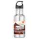 Paisagem de montanha em vermelho e azul com um lago e um arco-íris azul arrojado.