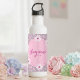 Custom daisy water bottle in pastel pink and dark pink, on a dotted background.