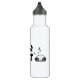 Três adoráveis pandas sentados ao lado um do outro. Um panda feliz está vestindo uma camiseta com "I Heart Panda" escrito nela. Outra é oferecer um bastão de bambu verde a um terceiro panda que adormeceu.