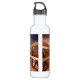 Garrafa de água com uma ponte cênica de madeira que conduz a um caminho rodeado por árvores florestais que mudam de cor.