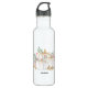 Garrafa de água com bombas brancas de cor aquosa de rico com acentos de brilho dourado sujo. Cercados por folhas verdes e flores rosas selvagens.