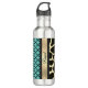 Nesta garrafa de água de na moda é um padrão elegante de quatrefoil em um plano de fundo turquesa com uma fita de ouro brilhante onde ela pode ser personalizada e, ao lado da fita, uma design de girafa exótica criando as vibrações chic.