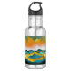 Cena de paisagem abstrato de uma zona de montanha com colinas rolantes e uma tempestade de chuva em laranja, ouro, azul e ciano.