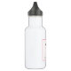 Uma garrafa de água personalizada com o seu nome dentro um quadrado branco com casca de ovo com uma borda rosa e uma mão desenhada rosa flor silvestre com um caule e folhas verdes compridos. Design floral branco e bonito.