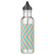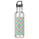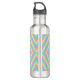 Stainless steel water bottle with a vibrant, rainbow geometric pattern featuring concentric diamond shapes. Black screw cap with a handle, modern and colorful.