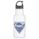 O clássico logotipo S-Shield do Super-Homem em azul claro com um recorte de Metrópolis visto através do "S", em um fundo azul nublado de céu padronizado.