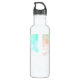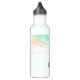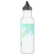 Garrafa de água com uma borda de abstrato ao longo do topo, com cores verdes e azuis giratórias. Um design suave e suave. Uma textura leve de papel aquoso atrás da imagem.