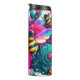 Este design delicioso mostra vários zangões com asas brilhantes, abanadas arco-íris, zunidos em meio a uma vibrante explosão de fúcsia, rosa e rosas de chá. Estruturas de colmeia ouro e minúsculos corações estão espalhados por todo o lado, adicionando charme caprichoso. A artista detalhada cria uma cena floral viva, colorida e encantadora, perfeita para um cambaleador decorativo.