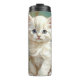 Tumbler térmico com um gato branco no estilo de Alphonse Mucha! Este gatinho liso e de olhos azuis posou com flores cor-de-rosa e cobertores azuis. Um presente fabuloso para amantes de gatos e colecionadores de Art Nouveau!