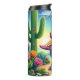 Esta é uma ilustração com um tema de fantasia de um tatu multicolorido caminhando por um jardim de cacto exuberante. O tatu tem uma carapaça vibrante, de cor arco-íris e está cercado por vários cactos florescentes com flores cor-de-rosa e laranja. O fundo é uma paisagem desértica brilhante com um céu azul e pássaros voando em cima. A cena inteira tem uma estética química e serena.