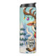 Esta ilustração engraçada mostra uma rena cansada vestindo um chapéu de Papai Noel, com uma corda de luzes enredada em suas galhadas. Ele segura uma caneca de café que diz 'SNOW OFF', e uma placa atrás dela diz 'NOT JOLLY ANTES DO CAFÉ.' A cena, completa com um grande despertador, captura o humor de feriado relacionado à necessidade de cafeína.