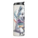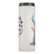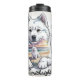 Esta ilustração gráfica apresenta um cão branco liso com olhos castanhos e uma expressão feliz. Uma cena de sol estilizada no oceano com um pequeno cachorro é visível em seu corpo. O texto "As patas fazem tudo melhor" é escrito em um roteiro lúdico ao lado do cachorro, rodeado de pegadas. A arte tem um humor saudável e alegre.