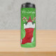 Esta garrafa térmica para manter suas bebidas frias ou quentes é verde com espirais de rico e um gnomo com uma barba branca, dentro de Natal vermelho e branco com canas doces e folhas sagradas. Personalize seu nome com o modelo.