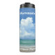 This thermal tumbler features a storm cloud brewing in the horizon over a tropical blue sea. This coastal seashore thermal tumbler has it all, blue sky, white clouds, aquamarine ocean and sandy beach while the surf breaks along the shoreline. Personalize this personal piece of beachfront property with her Name for a beautiful gift of oceanview.