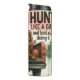 Uma na moda com cabelo verde escuro e um chapéu sentam-se confiantemente no portão traseiro de um caminhão. Ela veste uma camisa xadrez, calças de camuflagem e botas resistentes, com um arco inclinado contra o caminhão. A imagem é acompanhada pelo texto empoderador "CAÇADA COMO UMA GAROTA" e parece fofo fazendo isso, colocado contra um pano de fundo sugerindo um tema de caça ao ar livre com pinheiros.