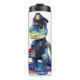 A cute, cartoon-style alligator dressed as a police officer holds a colorful birthday cake with a lit candle. With his bright green eye, navy uniform, and playful expression, he stands on a vibrant red and blue rug, blending duty with celebration in a fun, charming way.
