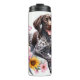 Um pintor alemão de borda curta alegre, com boca aberta e cauda ondulada, é brincalhão em meio a uma variedade vibrante de girassóis e péromos cor-de-rosa, com toques de flores silvestres azuis e outras coloridas. O trabalho de arte capta o espírito enérgico e feliz da raça dentro de um ambiente floral vivo.