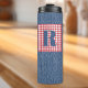 Um impressão de denim azul nesta bandeja de 12 oz com quadro de verificação vermelho e branco e uma grande inicial azul. Altere facilmente o início com o Modelo fornecido. Corpo sem manchas, tampa de plástico. A construção de paredes duplas seladas por vácuo retém temperatura, calor ou frio. Presente fabuloso e personalizado para quem gosta do estilo denim e gingham branco-vermelho. Consulte "Sobre este produto" ao lado para obter mais informações e cuidados.