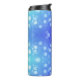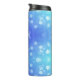 Blue travel mug with a black lid featuring a pattern of white bokeh circles, creating a calming and modern look.
