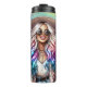 Uma na moda com cabelos louro longos e fluentes, com realces vibrantes azuis, cor-de-rosa e roxos, veste um chapéu e óculos de sol largos, piscando um sorriso brilhante. Ela segura um café gelado em uma mão e uma alça de saco de franja na outra, cercada por pias roxas e rosadas. O fundo é uma mistura de matizes pastéis e uma sutil impressão leopardo.