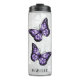Aproveite qualquer bebida enquanto estiver em viagem com um Tumbler térmico personalizado com borboleta púrpura. O design do Tumbler apresenta um par de borboletas vibrantes que repousam sobre uma vinha floral branca contra um fundo de nuvens de cinza clara. Itens de presentes adicionais disponíveis com este design, bem como uma variedade de cores.