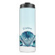 As conchas de serigrafia em tons de azul, contra um fundo azul e branco, fazem um belo tumbler térmico.
