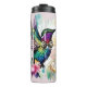 A brushstroke-style design featuring a vibrant hummingbird adorned with a spotted bow tie, its wings fluttering as it hovers gracefully above a nest fille