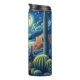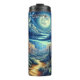 Esta ilustração mística representa um caminho arenoso enrolamento que atravessa uma paisagem desértica cheia de vários cactos e plantas do deserto. Formações de rochas em direção a um lado sob um dramático céu noturno com uma lua de cheio brilhando intensamente em meio a nuvens em espiral e numerosas estrelas.