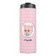 Um desenho animado de porco com bolinhas em um tumbler térmico de fundo rosa.
