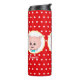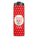 Um desenho animado de porco com bolinhas no tumbler térmico de fundo vermelho.