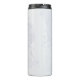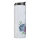Linda tumbler térmica romântica com flores azuis empoeiradas e roxas e algumas folhas verdes .