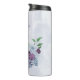 Linda e romântica caneca térmica com flores azuis poeirentas e roxas e algumas folhas verdes .