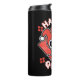 Confira Chibi Harley Quinn enquanto ela faz as divisões em frente a um pano de fundo de diamante de bolinhas vermelha com seu nome escrito em volta dela.