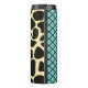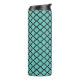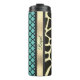 Neste na moda, o humilde térmico é um padrão elegante de quatrefoil em um plano de fundo turquesa com uma fita de ouro brilhante onde pode ser personalizada, e ao lado da fita está uma design de girafa exótica que cria vibrações chic.