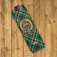 Crachá da crista Clan Scott rodeado por uma correia e fivela sobre fundo de tartã verde. Texto personalizado.