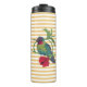 Tumbler térmico com ilustração de colibri e listras horizontais douradas.